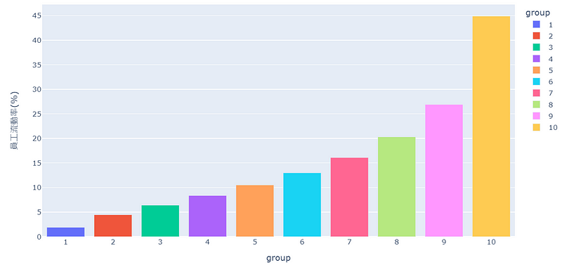 data['group'] = pd.qcut(data['员工流动率(%)'], q=10,labels = [i for i in range(1,11)])