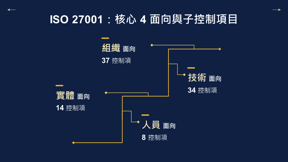上述提及的标准及规范两部分即是主条款与附录 A,主条款(标准)强调应决定可接受的资安风险并以此建立完整的管理周期,附录 A(规范) 则是提供 93项控制措施,对组织、技术、实体与人员四面向进行详细的风险控制规范。